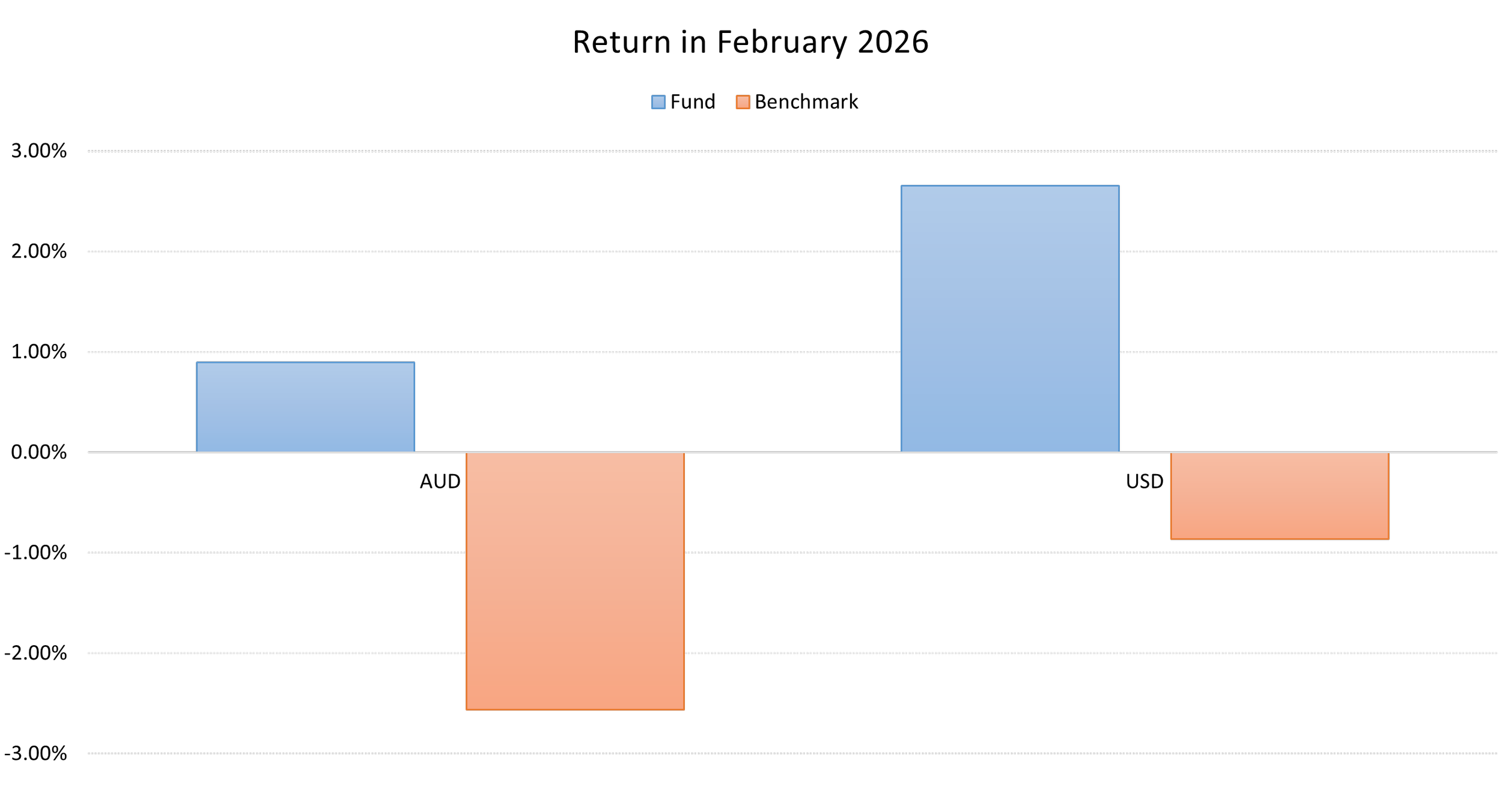 February was a solid month for the fund. After fees, we delivered 2.65% in USD terms (vs benchmark of -0.86%) and 0.89% in AUD terms (vs -2.56% benchmark). As this indicates, the AUD appreciated during February, weighing on AUD performance.