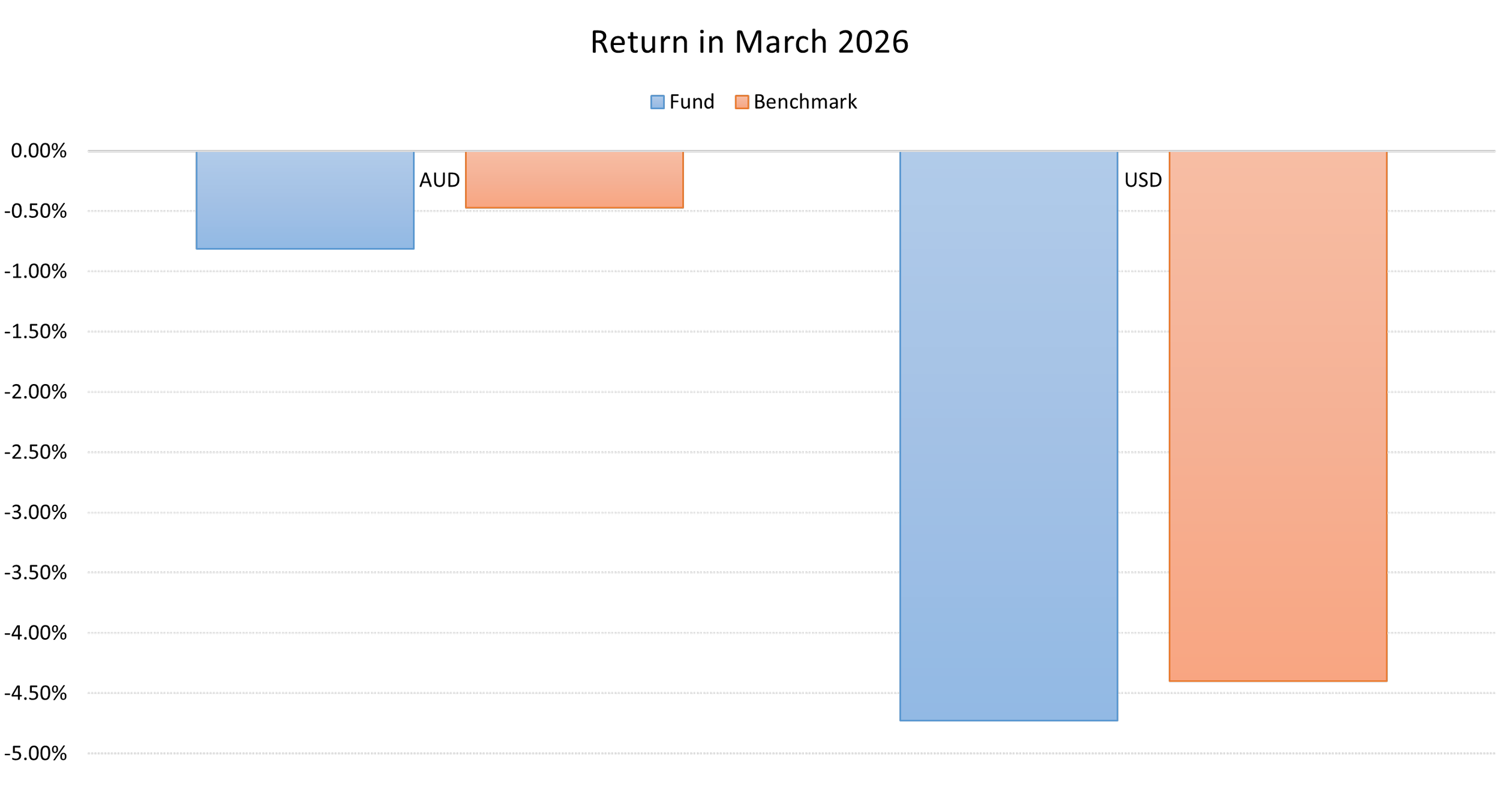 March was a volatile month. The weak US market performance was partly offset by depreciation in the AUD (increasing the value of our US holdings in AUD terms). In USD terms, we fell 4.7% (vs 4.3%, benchmark). However, in AUD terms we declined 0.81% (vs the benchmark falling 0.47%). However, it is important to put this into the context of longer term performance.